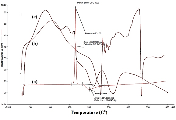 Fig. 5: DSC curves of (a) pure famotidine; (b) Famotidine-alginate microspheres; (c) Famotidine-GMO-alginate microspheres