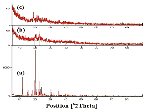 Fig. 6: X-ray curves of (a) pure famotidine; (b) Famotidine-Alginate microspheres; (c) Famotidine-GMO-Alginate microspheres