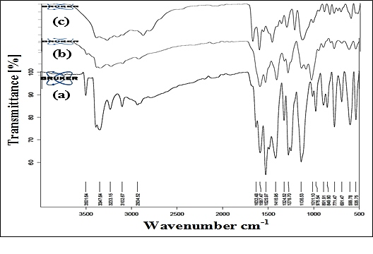 Fig. 7: The FTIR of (a) pure famotidine; (b) Famotidine-alginate microspheres; (c) Famotidine-GMO-alginate microspheres