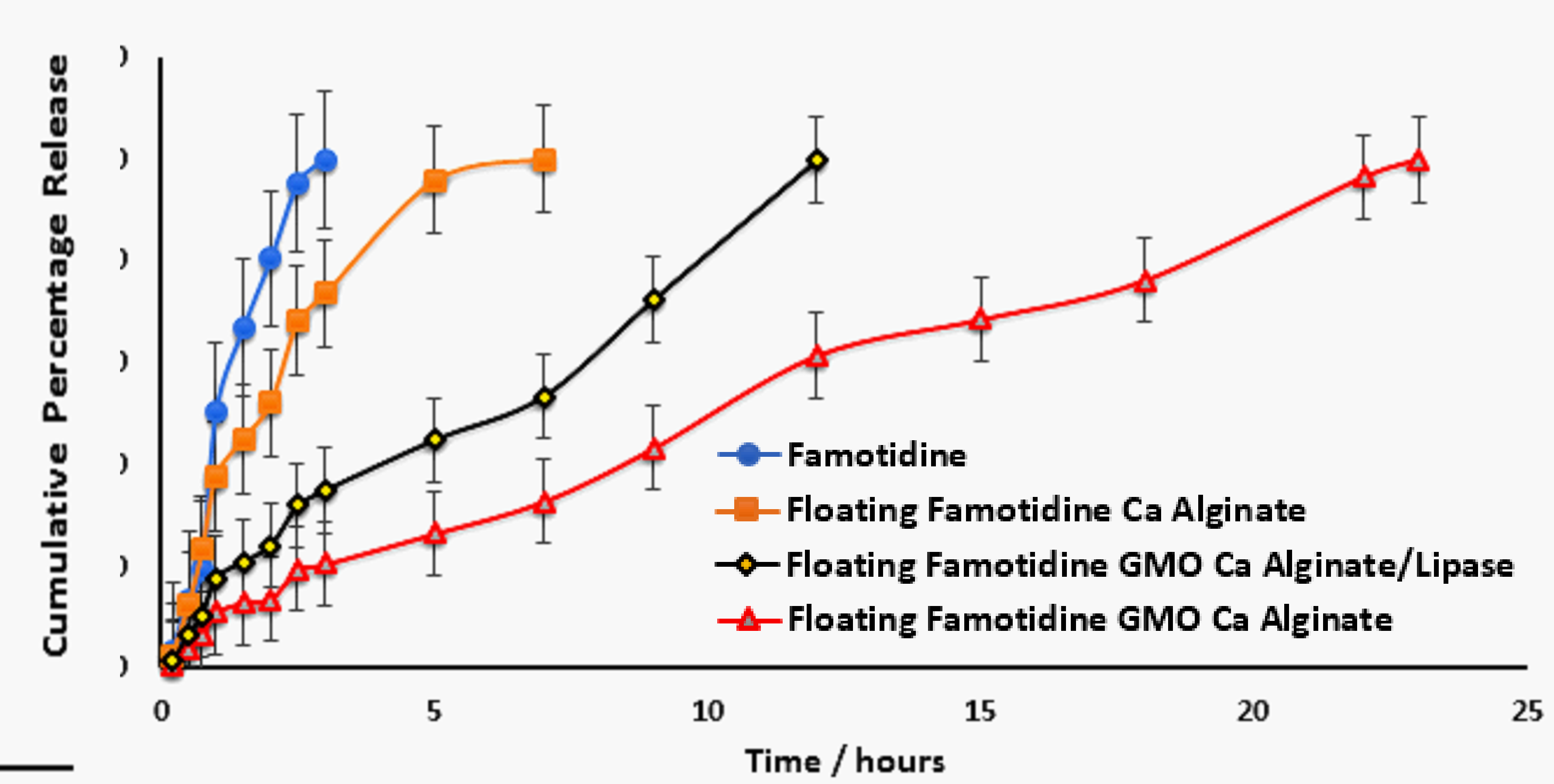 Free famotidine | Floating Famotidine-alginate microspheres | Floating famotidine-GMO-alginate microspheres/lipase |