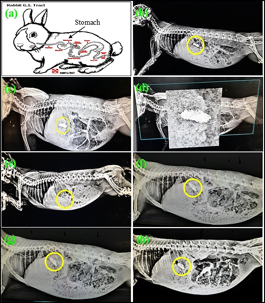 Fig. 9: X-ray imaging of Capsules coating the Floating Famotidine microspheres; (a) Rabbit GIT diagram, (b) Famotidine-Alginate [5 min], (c) Famotidine-GMO-Alginate [5 min], (d) Famotidine-GMO-Alginate [5 min]5X magnification, (e) Famotidine-Alginate [3 h], (f) Famotidine-GMO-Alginate [3 h], (g) Famotidine-GMO-Alginate [6 h], and (h) Famotidine-GMO-Alginate [12 h]. BaSO4 was used as radiopaque contrast in all microspheres prepared