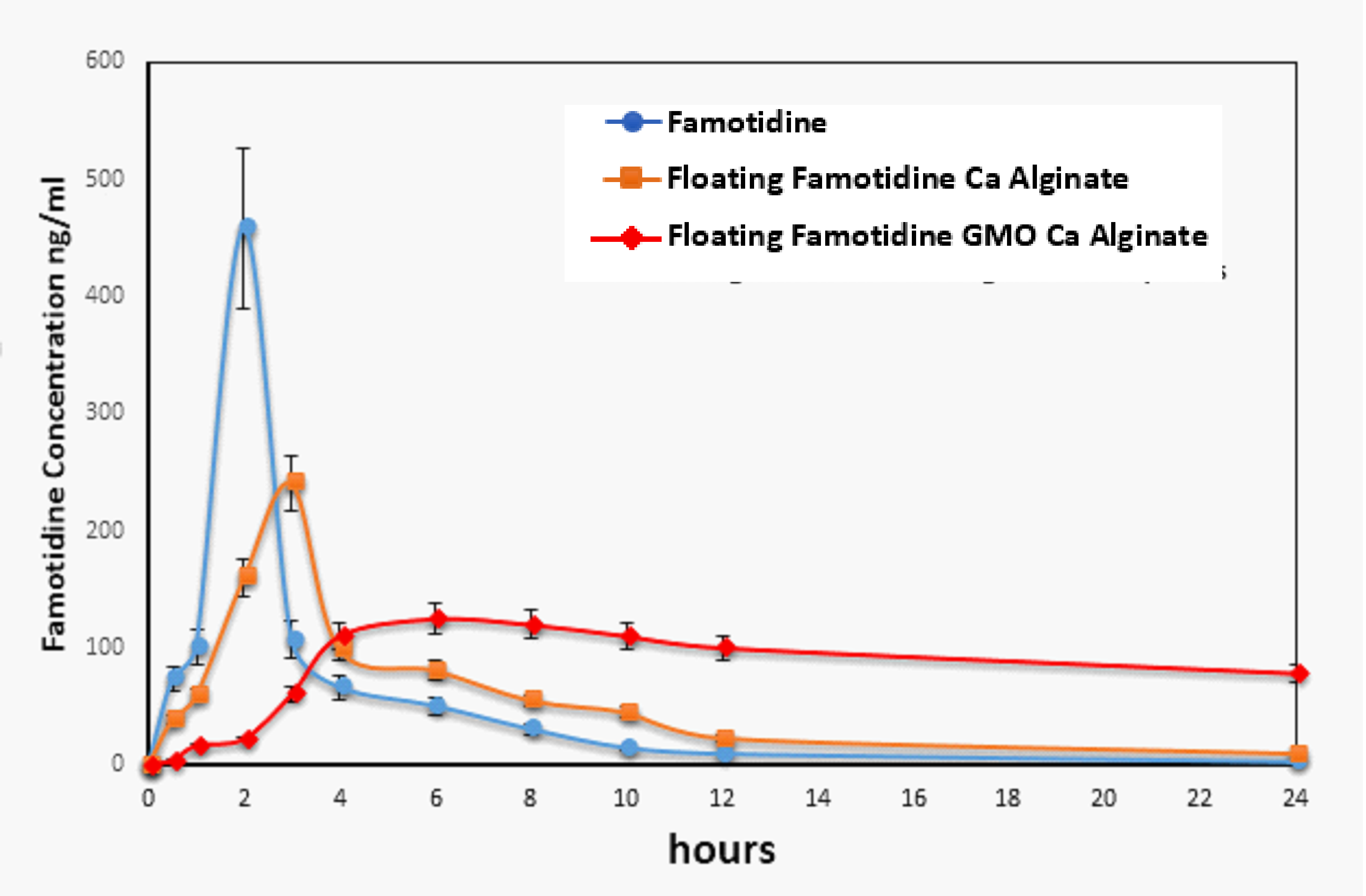 Results: Floating Famotidine Alginate-GMO microspheres (0.75:1:0.25) w/w/w showed a remarkable entrapment efficiency (>98%), good buoyancy (>84) and prolonged in vitro drug release properties (>24 hours). DSC, XRD, and FTIR techniques showed no evidence of interaction between Famotidine and Alginate or GMO. In vivo Imaging of Famotidine floatable microspheres showed that capsules containing Famotidine-Alginate microspheres were not detected after 3 h of administration, while capsules containing Famotidine-GMO-Alginate microspheres can be detected for more than 12 h, indicating superior gastric retention properties. The pharmacokinetic parameters were calculated for Famotidine: GMO-Alginate, and Famotidine: alginate and compared with the plain drug over 24 h period. Famotidine: GMO-Alginate microspheres exhibited controlled and prolonged absorption Tmax of 6.0 vs. 3.0 and 2.0 h; Cmax of 124.9±0.9 vs. 323.7±0.4and 458.6±0.5 ng/ml; AUC0-24 of 2153.025±6.7 vs. 1650.4±1.9 and 1110.725±2.1 ng/ml for Famotidine: alginate and plain drug, respectively, reflecting the increase in the bioavailability of the drug in the floating formulations compared to the free drug.