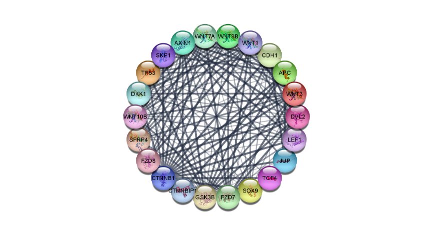 Analysis was carried out via the STRING database website (https://string-db.org) to show protein-protein interactions involved in Wnt signaling in colon cancer [14].