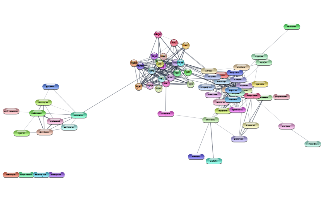 The drug-target interactions and protein-ligand interaction analysis were determined using STITCH (http://stitch.embl.de). A total of 22 protein nodes and 47 drugs were inputted, and an enrichment p-value of 0<0.05 was obtained, which means it has a good significance level. The test results found that some drugs can interact with the target protein while many other drugs only interact with each other without being able to bind to the target (fig. 2).