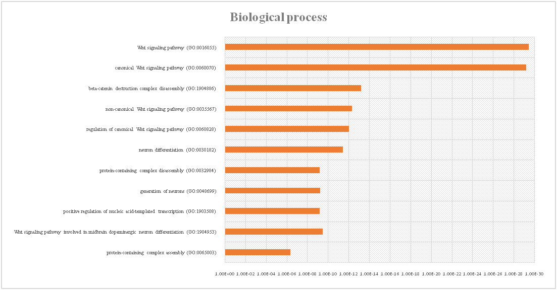 Fig. 3 shows a bar chart, each representing the top 10 terms from the search results based on the selected gene with the smallest p-value. The color of each bar represents a significant p-value (<0.05)—the sign (*) next to the p-value indicates that the term also has an appropriate significance level. The higher the bar, the smaller the adjusted p-value. The results of GO enrichment in biological processes showed that the Wnt signaling pathway (4.36e-31) had the smallest p-value indicating the highest significance level. GO enrichment in cellular components showed that the catenin complex (3.3e-08) had the smallest p-value. GO enrichment in molecular function shows that Frizzled binding has the highest significance level with the smallest p-value (3.33e-15).