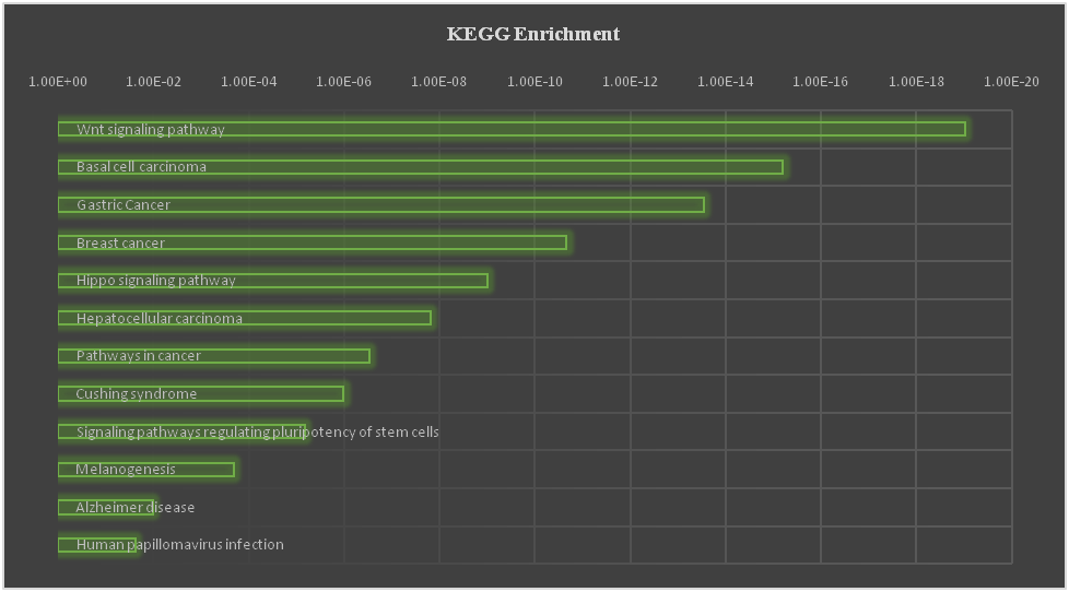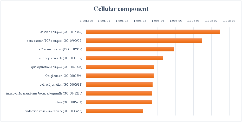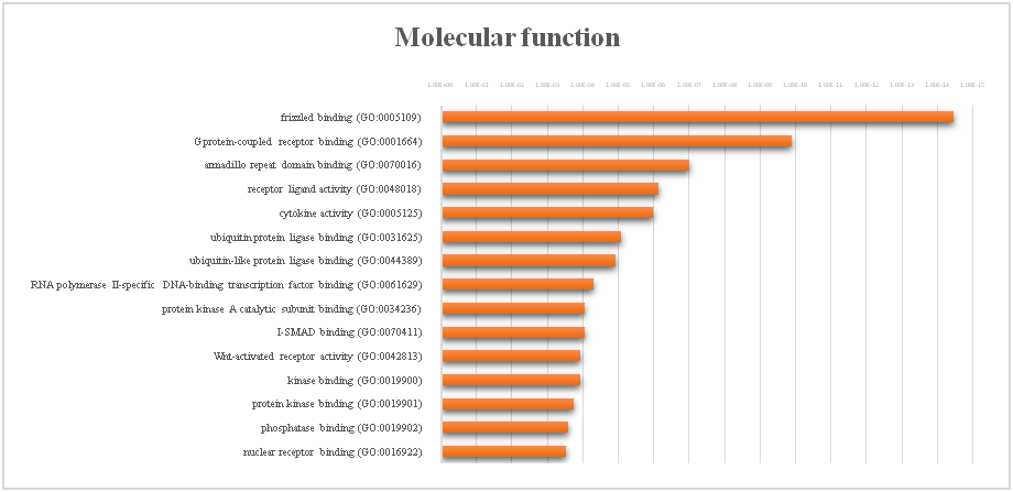 To further investigate the drug mechanism in treating colon cancer in the Wnt/β-catenin signaling pathway, target genes were analyzed for GO enrichment and KEGG pathway. GO enrichment analysis involves biological processes, cellular components, and molecular functions. Twenty-two potential target genes for colon cancer in the Wnt/β-catenin signaling pathway were analyzed using Enrichr (https://maayanlab.cloud/Enrichr), and the top 10 topics of each GO enrichment are shown in fig. 3-5 and tables 3 and 4.