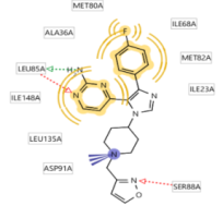 | 4 | 4TN6 | PFO | 4-{4-(4-fluorophenyl)-1-[1-(1,2-oxazole-3-yl methyl)piperidin-4-yl]-1H-imidazol-5-yl}pyrimidin-2-amine | 2.41 Å | - | [21] |