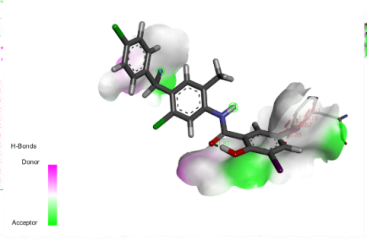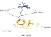 Three features of HBD bind to NH and interact with the amino acids ASP1521A and ASP1521B. One feature of the HBA interacts with the amino acid ASP1521A, and the feature of PI binds to the NH atom. On the other hand, two hydrophobic features interact with the amino acids MET1584A, MET1584B, and TRY1502A.