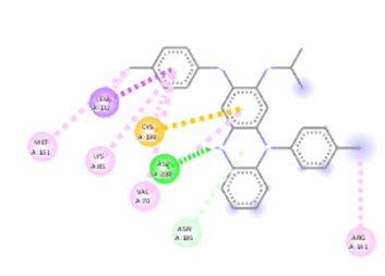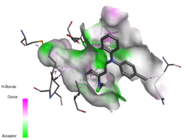 Model-2 shows the structure of the protein CDK1 (PDB: 4TN6) complex with the compound PFO401 that forms the pharmacophore model is shown in fig. 5B. The results of the pharmacophore modeling found seven different chemical features, including one hydrogen bonds donor (HBD), two hydrogen bonds acceptor (HBA), one positive ionizable area (PI) feature, and three hydrophobic features (H). In this pharmacophore model, several volume exclusion features that do not interact with amino acids are intentionally omitted to maintain optimal pharmacophore features.