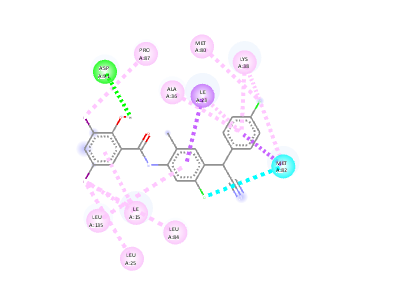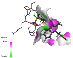 The resulting pharmacophore features of the protein-ligand complex 4TN6 show that the hydrophobic interaction features marked in yellow interact with several selected proteins and amino acids. The hydrophobic feature that binds Fluorine interacts with the amino acids MET80A and ILE68A. The hydrophobic feature that binds to piperidine interacts with the amino acids ALA36A, MET82A, and ILE32A. One other hydrophobic feature also interacts with the amino acids ILE148A and LEU85A, which also interacts with one HBD feature. On the other hand, there are features of PI interacting with amino acid ASP91A and features of HBA interacting with amino acid SER88A. This model found 38 hit compounds from 47 drugs at omitted 4. Each hit compound has three different chemical features.