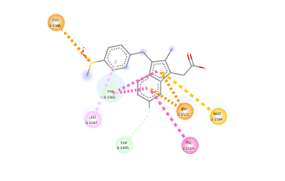 After the protein and native ligand validation process, several drugs that were hit compounds were docked again using PyRx Vina to evaluate their binding capacity. Of the 27 drugs, 12 of them produced a higher binding affinity than the native ligand, as shown in table 5. The highest binding affinity for each target protein was clofazimine with 3ZDI (-9.5 kcal/mol), Etodolac with 4TN6 (-9.5 kcal/mol), Sulindac with 6MXY (-8.1 kcal/mol), and Sulindac with 6TFB (-8.0 kcal/mol). Visualization of docking results using BIOVIA Discovery Studio software, as shown in fig. 6.