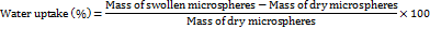 The water uptake of the cross-linked microspheres loaded with the NCR was determined by measuring the extent of swelling behaviour in pH 1.2 buffer solution for 12 h. Briefly, weighed Ms sample (100 mg) was immersed in an aliquot of 25 ml 1.2 buffer for 24 h at RT with gentle shaking. Samples were removed from the solution. The excess surface-adhered liquid was removed by using soft tissue paper. The swollen microspheres were weighted using an electronic microbalance. The microspheres were dried in an oven at 60 °C until there was no change in the dried mass of the samples. The swelling index was calculated by using the formula [16].