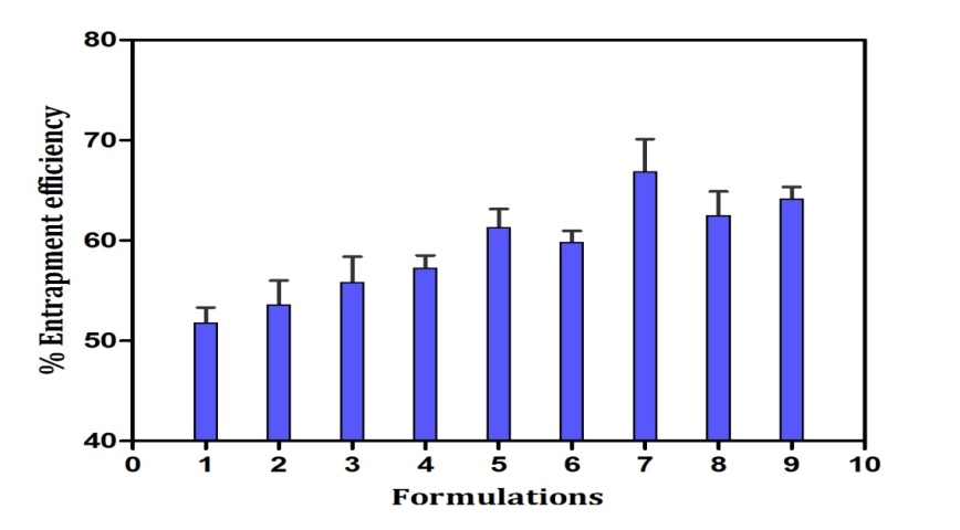 Fig. 1: % Entrapment efficiency of microsphere formulations, Each value represents mean±SD, (n=3)