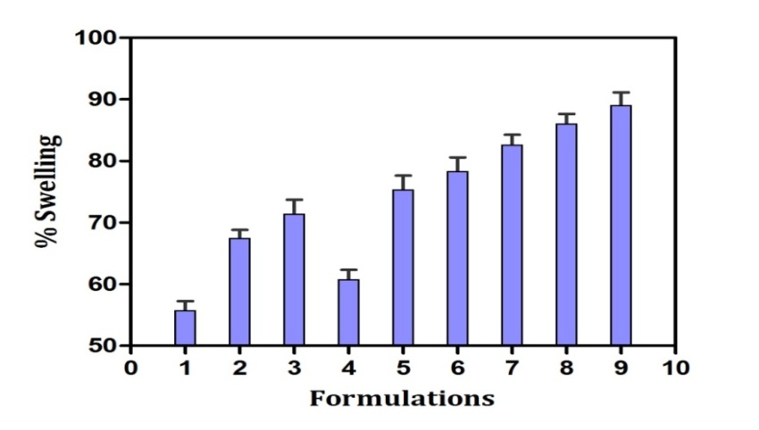 The swelling behaviour of microspheres defines the extent of mucoadhesion and drug release patterns through microspheres. The % swelling index for mucoadhesive formulation for all batches was found in the range of 55.81±0.47-89.08±0.06, respectively, as shown in fig.3. The % swelling index of optimized NCR MMs revealed around ~ 82.69±0.40. According to optimization results, NCR MMs demonstrated a high swelling index due to the excellent swelling property of fenugreek gum. It contains hydrophilic groups of the poly-branched structure, which leads to a greater extent of water absorption and holding capacity, resulting in the swelling of microspheres [25].