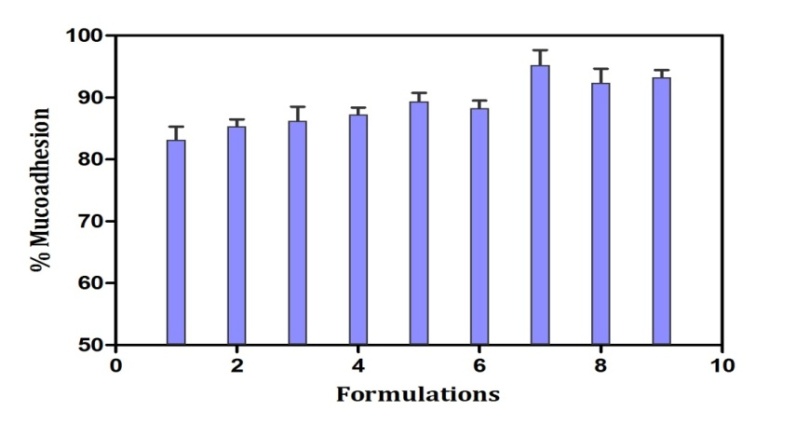 Fig. 4: Mucoadhesion study of formulations, each value represents mean±SD, (n=3)