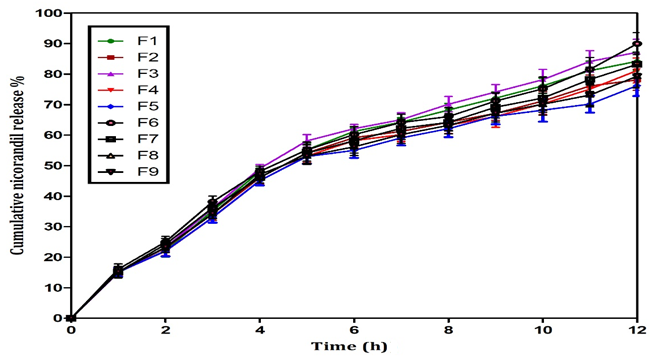 Fig. 5: %Cumulative drug release of formulations F1-F9, each value represents mean±SD, (n=3)