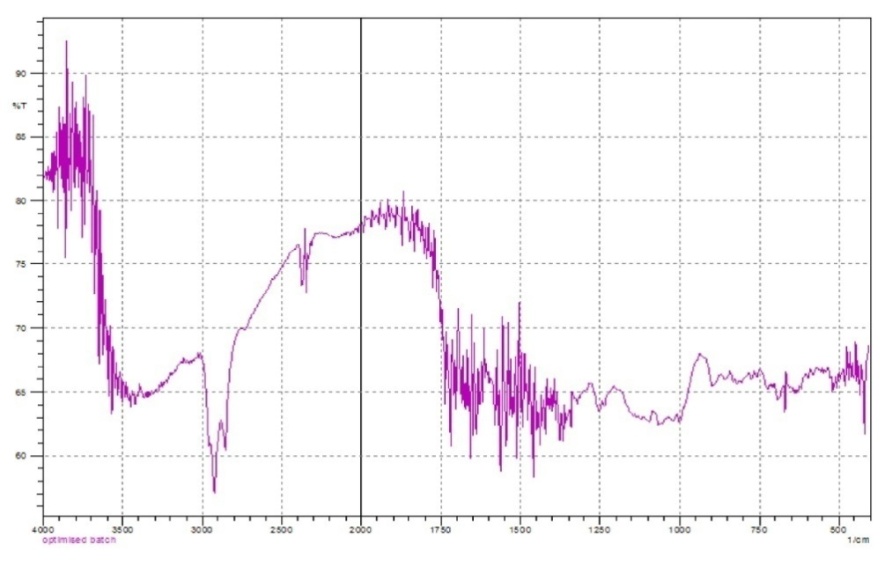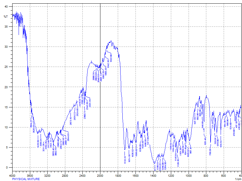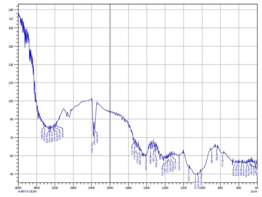 FTIR is an essential analytical technique used for drug-polymer interaction studies. FTIR analysis was carried out using a Fourier Transform Infrared Spectrophotometer (Model: 84005, Shimadzu Asia Pacific Pvt. Ltd., Singapore). Briefly, the samples of NCR, fenugreek gum, karaya gum, physical mixture (PM) and NCR MMSs were weighed with the FTIR grade of potassium bromide and compressed into thin transparent discs using a Mini Hand Press Machine (Model: MHP-1, P/N-200-66, 747-91, Shimadzu, Kyoto, Japan). This disc was then scanned at a wave number range of 400 to 4000 cm‐1 under the scanning resolution of 4 cm1. The scanned image of each FT-IR sample was analyzed and interpreted using the instrument-accompanied software (IR Solution, version 1.10) [20].