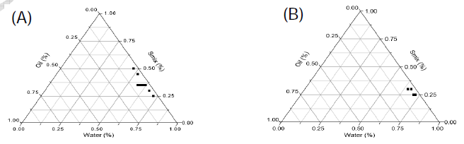 Fig. 1: Pseudo-ternary phase diagrams of o/w nanoemulsion composed of VCO as oil, Tween 80 as surfactant, and an admixture of PEG 400 and glycerin as co-surfactant (Smix 3:1) (A); VCO as oil, Tween 80 as surfactant, and glycerin as co-surfactant (Smix 2:1) (B)