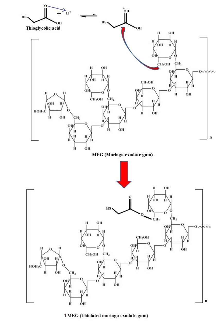 MEG is a plant exudate-derived polysaccharide posing an arabinogalactan structure reported to contain L-galactose, L-arabinose, L-rhamnose and L-gluconic acid residues [32]. The yield of extracted MEG from the bark exudate-material of Moringa oleifera Lam. trees was found 18.54%. The extracted MEG was found as creamy in color and soluble in water (both hot and cold). The yield of the thiolated product-TMEG was found, 44.62%. The obtained TMEG was creamy-white colored and it was found soluble in water (both hot and cold). In the present investigation, the thiolation reaction among the hydroxyl (-OH) groups of MEG (from the bark exudate-material of Moringa oleifera Lam. trees) and carboxyl (-COOH) group of thioglycolic acid (used as thiolating agent) was performed to synthesize the thiolated product (i.e., TMEG). This reaction occurred in the acidic environment as 7 N hydrochloric acid was used in the thiolation reaction. A schematic representation of the thiolation of MEG using thioglycolic acid to synthesize the thiolated product (i.e., TMEG) is presented in fig. 1.