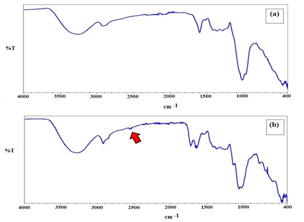 Fig. 2: The FTIR spectrum of: (a) MEG (extracted from the bark exudate-material of Moringa oleifera Lam. trees and unmodified) and (b) TMEG (synthesized and thiol-modified)