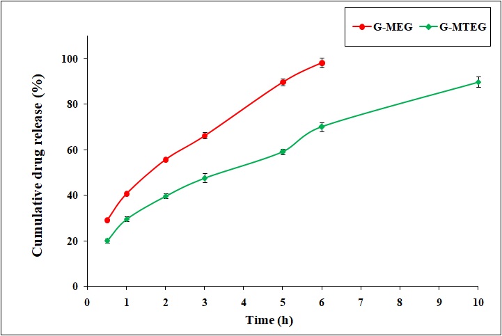 Fig. 4: Comparative in vitro metronidazole release from 1% w/w metronidazole gels containing MEG and TMEG (G-MEG and G-TMEG) in phosphate buffer, pH 6.8 [Data are expressed as mean±SD, n = 3]
