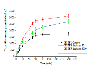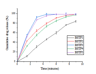 The number of times the flexible film folded until it broke was reported in table 2 as the values of folding endurance and found to fluctuated between 155-190 times, which confirms the non-brittle feature of the films. The lowest and highest values of folding endurance were observed with the formulation BSTF1 and BSTF5, respectively. The addition of Sepitrap 80 and Sepitrap 4000 as bio-enhancers increased the folding endurance of films. The highest folding endurance value of BSTF5 could also be correlated with the presence of the higher amount of Sepitrap 4000 (microencapsulated castor oil), which is already known to increase flexibility, as reported by [54]. On the other hand, lubrication of the vessel with glycerin could be considered for varying levels of flexibility in the films. In order to analyse the mechanical properties of the sublingual bilayer films peel tensile tester was used. According to the results shown in table 2, the formulation BSTF-1 possesses the highest tensile strength as it contain higher proportion of polymers, whereas the film preparation BSTF-5 has shown the highest extensibility when compared to all other film compositions. After observation, it was concluded that with the incorporation of permeation enhancers, Sepitrap 80 and 4000 tensile strength of the prepared bilayer sublingual films were decreased while the extent of elongation of the films increases as reported in the literature that polysorbate 80 and castor oil hold the properties of plasticizer [55, 56]. The increasing amount of permeation enhancers in the films reduces the interlocking between the polymer chains and is hence responsible for decreased tensile strength. It also seems that the highest extent of elongation in the BSTF-5 formulation was due to the presence of hydrogenated castor oil in Sepitrap 4000.