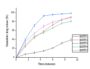 The percentage drug release of different batches of zolmitriptan and piroxicam bilayer sublingual films in the buffer solution having pH 6.8 is shown in fig. 5. For formulations BSTF2, BSTF3, BSTF4 and BSTF5 containing Sepitrap 80 and Sepitrap 4000 in different concentrations respectively, it was shown that the addition of bio-enhancers significantly affect the dissolution of the drug when compared to BSTF1 without bioenhancer. Similar abilities of Sepitrap 80 and 4000 were demonstrated by El-Setouhy et al. in 2015 [43]. 80 percent of zolmitriptan was released from all formulations within 9 min. However, the release of piroxicam was comparatively slow. The fastest release of both drugs was observed in the formulation BSTF-3 which contains Sepitrap 80 as a solubility and permeation enhancer at twice the weight of the drug. BSTF-3 that released approximately 92% of zolmitriptan was released within 3 min, whereas 92% of piroxicam was released within 4.5 min.