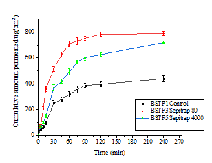 From the analysis of in vitro disintegration and dissolution tests, as formulations, BSTF-2 and BSTF-4 showed longer disintegration and drug release time; they were excluded from further ex vivo permeability studies. Fig. 6 shows the permeation profiles of bilayer sublingual films of piroxicam and zolmitriptan containing Sepitrap 80 (BSTF-3) and Sepitrap 4000 (BSTF-5) as bioenhancers. The permeation profile of BSTF-1 was used as control, which contains no bioenhancer. Thus, it shows the lowest permeation from the chicken buccal membrane. The permeation of both the drugs was found to be highest from the formulation containing Sepitrap 80 (BSTF-3) followed by BSTF-5. The enhancement factor (EF) of BSTF-3 and BSTF-5 compared to control BSTF-1 at different permeation time intervals. The EF of BEST-1 after 30, 90, and 240 min was 1, showing that there was no improvement in drug absorption via membrane, perhaps due to the lack of a bioenhancer in the formula. After 30, 90, and 240 min, the EFs of BEST-3 were (1.61, 1.70, and 1.78 for PRCM) and (2.05, 1.94, and 1.80 for ZOTP) whereas EFs of BEST-5 (1.40, 1.25, and 1.53 for PRCM) and (1.47, 1.55, and 1.64 for ZOTP) respectively. The greater drug penetration from Sepitrap 80 sublingual films might be attributable to a drug solubilization mechanism, a membrane contact mechanism, or both. As previously stated, all of the BSTFs showed complete drug dissolution after 9 min, indicating that the medication was totally free for absorption within 9 min. As a result, Sepitrap 80 increased drug penetration by interacting with the chicken membrane via microencapsulated polysorbate 80. Polysorbate 80 has previously been shown to improve drug penetration via buccal mucosal membranes. Sepitrap 80 increased the polysorbate 80 qualities as a bioenhancer not only by increasing membrane interaction properties and optimizing solubilization properties owing to the large surface area, but also by allowing large amounts of polysorbate 80 to be included into bilayer films.