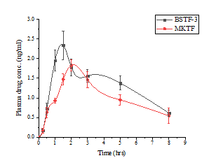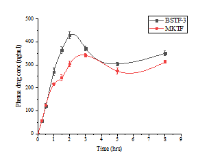 Fig. 7: The plasma concentration of three volunteers a) Zolmitriptan b) Piroxicam, versus time after administration of BSTF-3 and marketed formulation (MKTF)