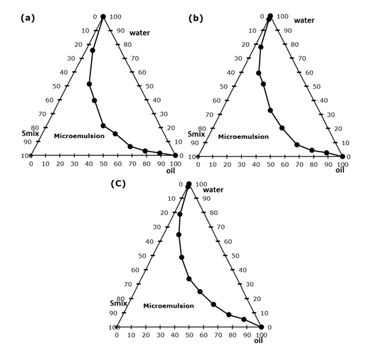 Microemulsions are formed when oil, surfactant and water are mixed in the correct concentrations. These combinations of concentrations are represented graphically by triangular diagrams known as ternary diagrams. Three sides of triangles represent 3 components viz. oil, surfactant and water. Since, surfactants alone cannot form good microemulsions, cosurfactants are often added in the system. This fourth component is taken in a fixed ratio and one side of the triangle is represented by the total concentration of surfactant and cosurfactant, often termed as Smix. Because of this fourth component, ternary diagrams are referred to as pseudo-ternary diagrams. For each ratio of surfactant and cosurfactant a separate diagram is plotted. The clear region obtained after water titration was marked in the pseudo-ternary diagrams. No further discretion was done based on microstructure in the pseudo-ternary diagrams. Three phase diagrams, each for surfactant mix: cosurfactant mix ratio (Smix) of 1:1, 2:1 and 4:1, were constructed using Microsoft Excel-based application.