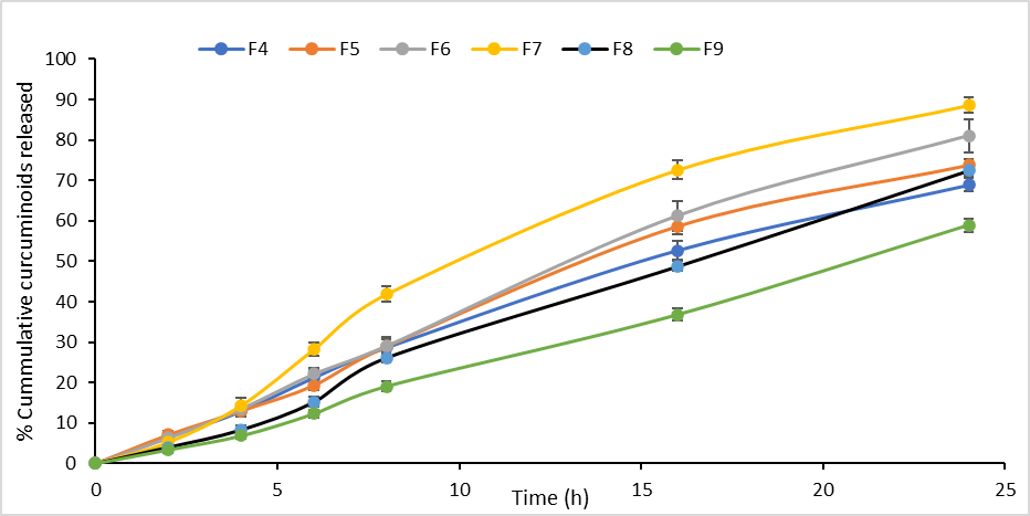 Objective of the formulation was to improve solubility and to increase the availability of phytoconstituents at the inflamed synovial joints. Higher availability of phytoconstituents will help in amelioration of inflammation. Surfactants at higher concentration will cause over solubilization of drug and poor release from the formulation [33]. To confirm release of curcuminoids from the phytoformulation in vitro release studies were carried out. Observations of in vitro release studies are presented in fig. 2. At the end of 24 h, curcuminoids release was found to be in the range of 58.89% to 88.60%. Lowest curcuminoids release were for batch F9 and highest release were for F7. Hence, the batch F7 with highest release of curcuminoids at the end of 24 h was selected.