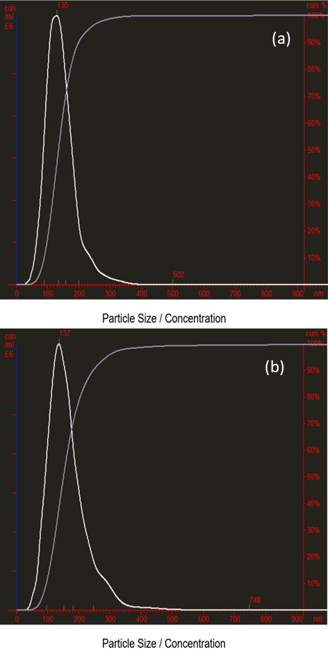 The mean droplet size of the placebo PF7 was 143 nm with a standard deviation of 46 nm (fig. 3a) as determined by NTA (Nanosight NS 500, Malvern, UK). Slight enlargement of globules was observed on incorporation of phytoconstituents and the batch F7 showed mean discontinuous phase droplet size of 169 nm with standard deviation of 94 nm (fig. 3b). The globule size for both the formulations was well below 200 nm indicating good stability and good penetrability.