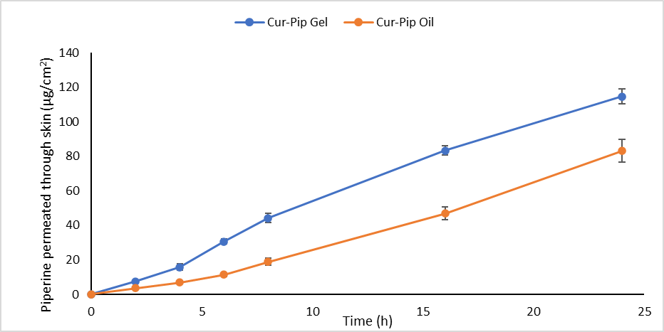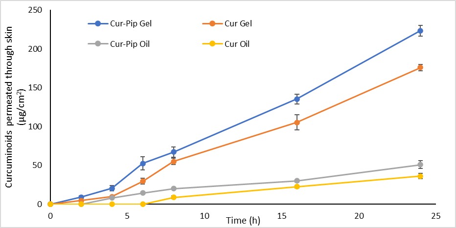 The ex vivo skin permeation studies were performed on pig ear skin [27] obtained from a local slaughterhouse. The whole ear skin was excised from domestic pigs and stored at −20 °C and were utilized within a month. Before the conduct of the study, the skin was thawed and mounted on a vertical Franz diffusion cell with stratum corneum facing the donor compartment. The receptor compartment was filled with phosphate buffer pH 5.5: 90% ethanol (1:1) of 10 ml. The receptor phase was kept under constant stirring at 37 ±1 °C. The formulations were applied to the pig ear skin. The aliquot (3 ml) was withdrawn at predetermined time intervals and an equal volume of fresh medium was added to the receptor compartment to maintain the sink condition. The samples were analyzed using a HPLC. The detection was carried out at a wavelength of 420 nm and 342 nm for the curcuminoids and piperine, respectively. The amount of phytoconstituents permeated through per unit area of the skin surface was estimated. Graph of the amount of phytoconstituent permeated against time was plotted. The flux was calculated as the slope of the linear part of the relation. Permeability coefficient was calculated as follows