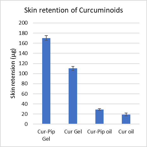 Fig. 8: Ex vivo skin retention profiles of curcuminoids from different formulations. Results are expressed as mean±SD (n = 3)