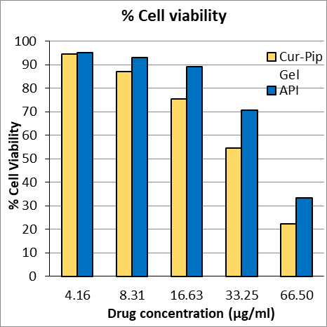 As shown in fig. 10, at concentration 4.16 µg/ ml pure phytoconstituents as well as the gel phytoformulation showed high cell viability. As the concentration increased cell viability decreased for the pure phytoconstituents as well as for the gel phytoformulation. Cell viability was more in case of phytoconstituents as compared to gel phytoformulation at higher concentrations. IC50 value of polyherbal formulation was found to be 30.34 µg/ml, whereas IC50 value of the phytoconstituents (3:1) was 38.77 µg/ml. This is due to better internalization of phytoconstituents by cells from the lipid- surfactant environment.