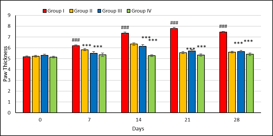 The data were expressed as mean ± SEM of 6 rats and analysed by one- way ANOVA followed by Tukey's post hoc test. Group I (arthritic control) was compared with Group IV (normal control) and Group II and Group III (treatment groups) were compared with Group I (arthritic control). #𝑃<0.05, ##𝑃<0.01, ###𝑃<0.001 versus Group IV. *𝑃<0.05, **𝑃<0.01, ***𝑃<0.001versus Group I.