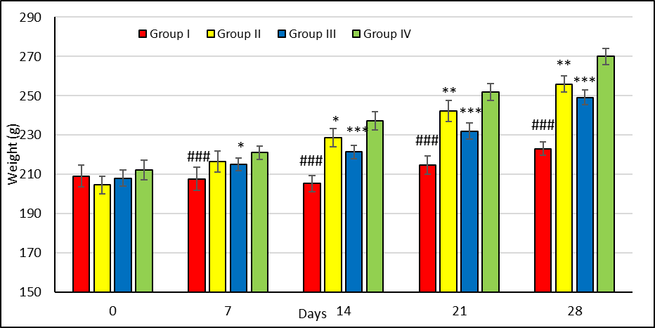Fig. 12: Effect of gel phytoformulation on weight gain in CFA induced arthritic rat. (Results expressed as mean ± SEM (n = 6) and analysed by one- way ANOVA followed by Tukey's post hoc test. Group I (arthritic control) compared with Group IV (normal control) and Group II and Group III (treatment groups) compared with Group I (arthritic control). #𝑃 < 0.05, ##𝑃 < 0.01, ###𝑃 < 0.001 versus Group IV. *𝑃 < 0.05, **𝑃 < 0.01, ***𝑃 < 0.001versus Group I.)