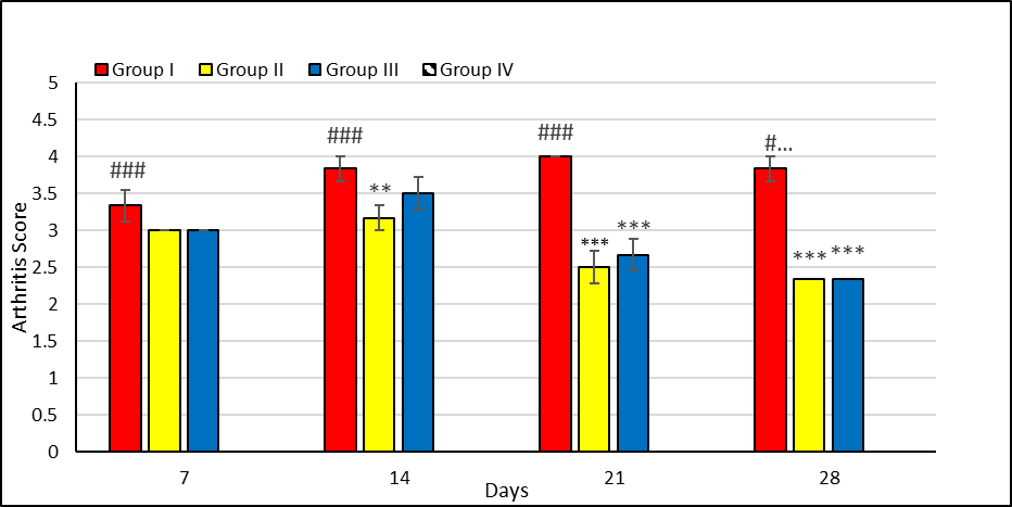 Fig. 13: Effect of gel phytoformulation on arthritis score in CFA induced arthritic rats. (Results expressed as mean±SEM (n = 6) and analysed by one- way ANOVA followed by Tukey's post hoc test. Group I (arthritic control) compared with group IV (normal control) and Group II and Group III (treatment groups) compared with Group I (arthritic control). #𝑃 < 0.05, ##𝑃 < 0.01, ###𝑃< 0.001 versus Group IV. *𝑃<0.05, **𝑃<0.01, ***𝑃<0.001versus Group I.)