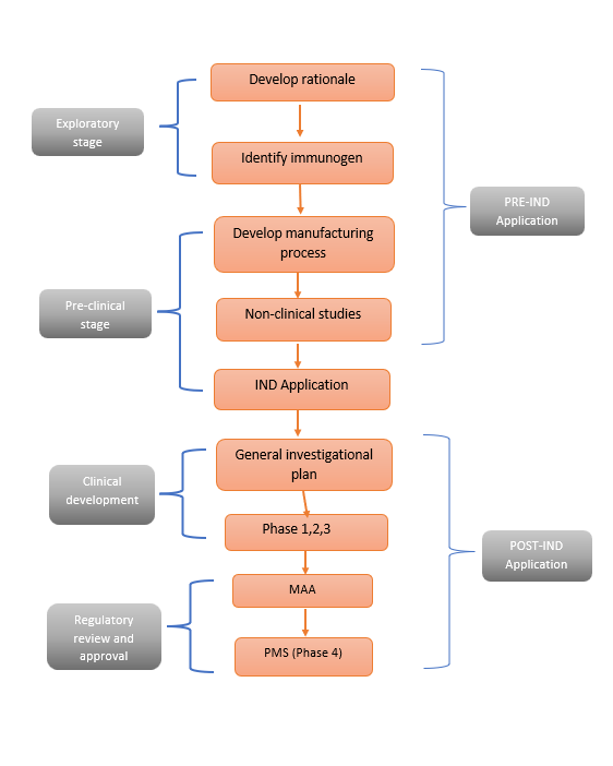 With IND approval, the clinical development step gets underway. Clinical testing using vaccinations on humans requires the creation of a general study plan. Phase I, II, and III clinical trials must all be conducted after receiving regulatory authority permission. It could take up to eight years to complete the final stage of clinical development [19]. It was depicted in the [fig. 2].