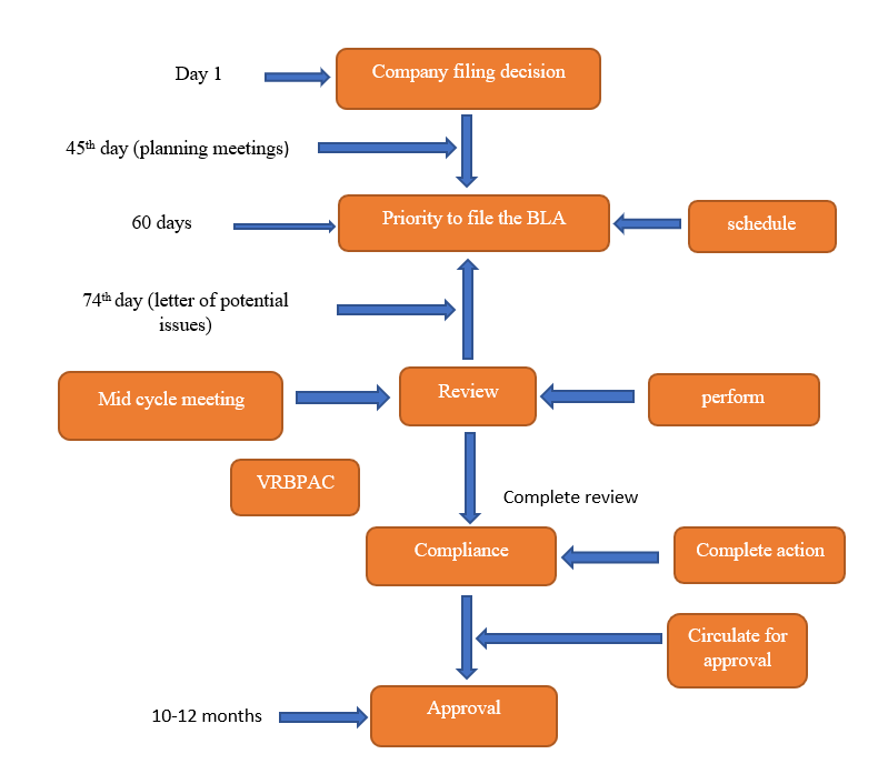 The decision to file a BLA begins the application procedure on day 1 during the application submission procedure. The meetings must be scheduled on the 45th day. The manufacturer will have 60 d to file the BLA with the appropriate materials and schedule the inspection window and other related tasks. The applicant’s eligibility for priority or standard review will be decided by FDA. Additionally, if the vaccine product significantly enhances public health, the manufacturer may ask for priority consideration.