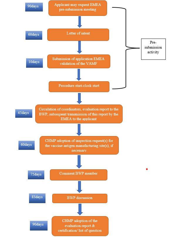 In the case of the Centralised method, the vaccine manufacturer must submit an application for a vaccine antigen master file prior to MAA approval. European Medicines Agency VAMF certification 2005. The makers will be able to choose between the marketing authorization procedure and the VAMF submission process during the pre-submission meeting with the scientific committees in general, centralised procedures are recommended, and the CHMP will conduct a scientific examination of the provided dossier. EMEA 2005 adverse events in the EU vaccine are recorded using the eudra vigilance system. The patient, the doctor, or the manufacturer can all report an adverse occurrence according to the eudra vigilance system. The report will be evaluated and the CHMP will take appropriate action by either approving or rejecting the product from the marketplace in 2003 the European Medicines Agency [44-46]. Approval process of Vaccine Antigen Master File (VAMF) were illustrated in [fig. 8].