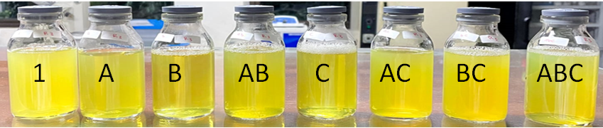 Fig. 1 shows the nanoemulsion formed from the obtained nanoemulsion, which is yellowish and transparent. The combination of tween-80 and span-80 is used as a surfactant that can unite the oil and water phases due to forming a film layer around the droplets. The HLB value of the mixture from the combination of tween-80 and span-80 ranged from 12–13. In addition, quercetin was used as an antibacterial agent, 70% ethanol to dissolve quercetin, and aquadest as a solvent.