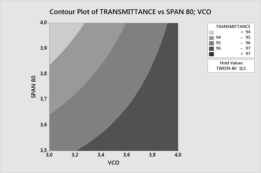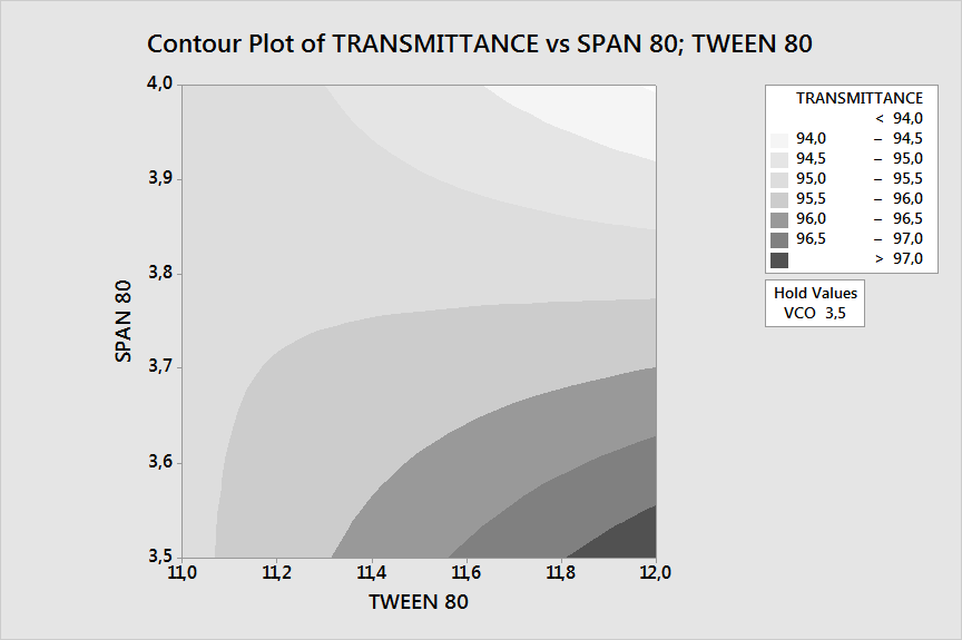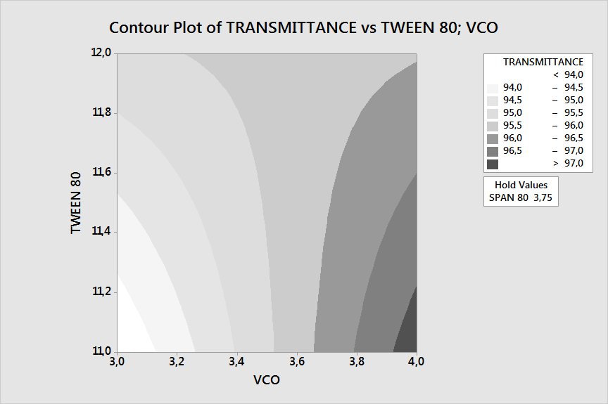 Conclusion: This study reported that the VCO amount of 3g, the tween amount of 12g and the span amount of 3.5g were found to be computational recommendations to achieve the optimum conditions only for percent transmittance value response.