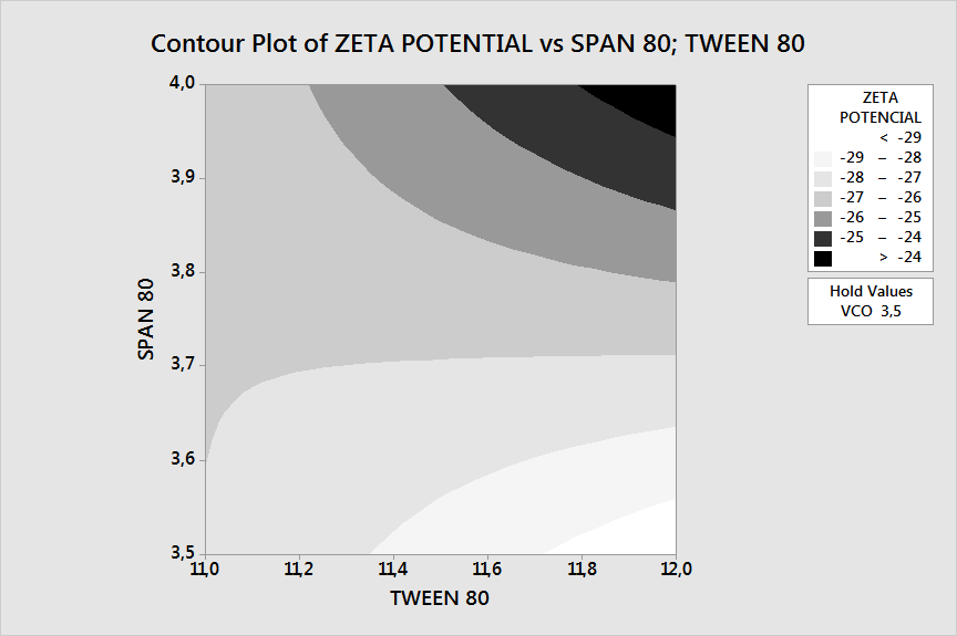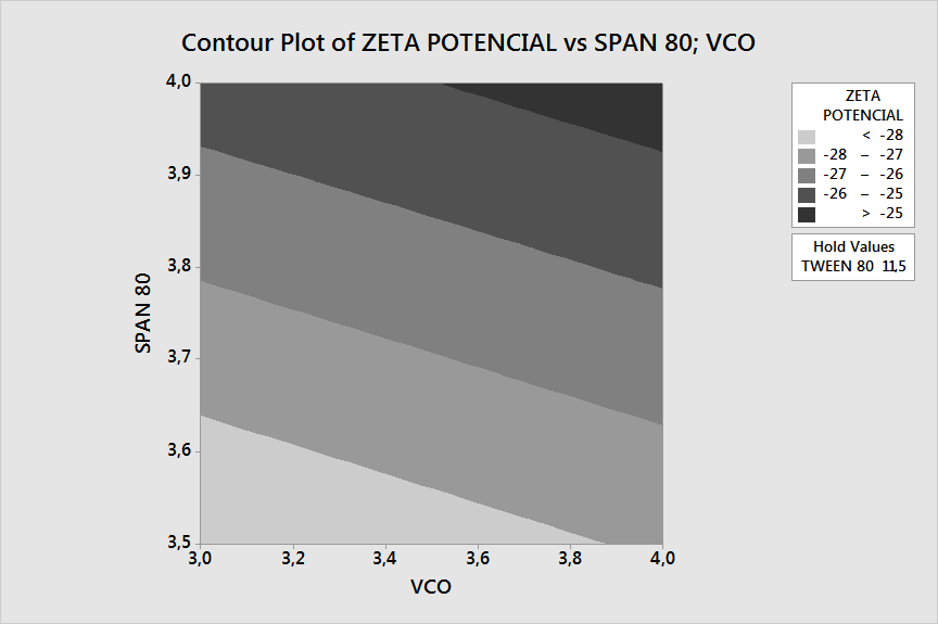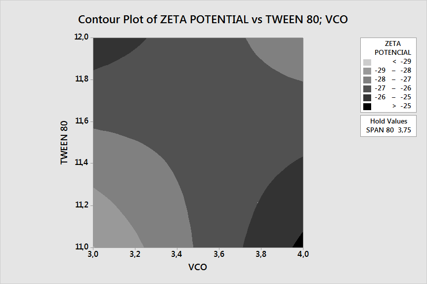 Fig. 3 is a contour plot showing the interaction results between tween-80, span-80, and VCO on the zeta potential response in 2D. Based on the resulting plot, it can be concluded that the entire area formed is the optimum area for the concentration of VCO, tween-80, and span-80 to the zeta potential response. This is because the area meets the desired zeta potential criteria of+30 mV to-30 mV [37].