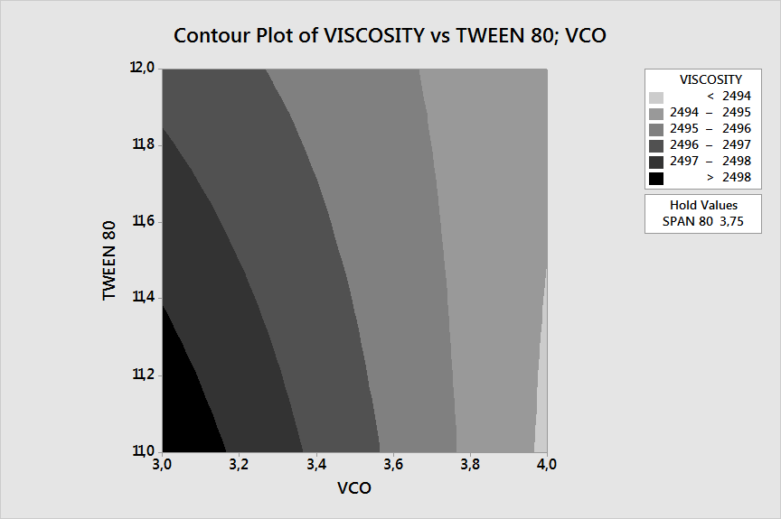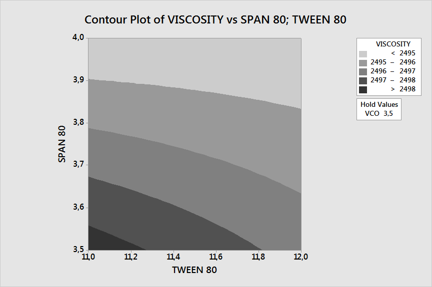Fig. 4: Contour plot response viscosity versus tween 80 and VCO (a) Contour plot response viscosity versus span 80 and VCO (b) Contour plot response viscosity versus span 80 and tween 80 (c)