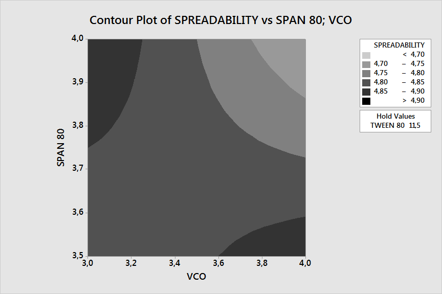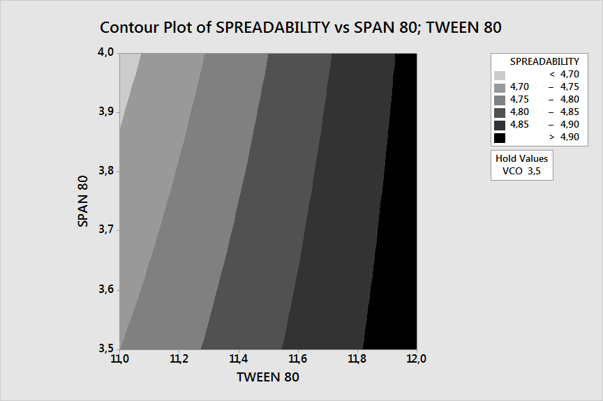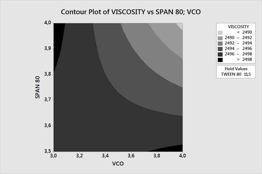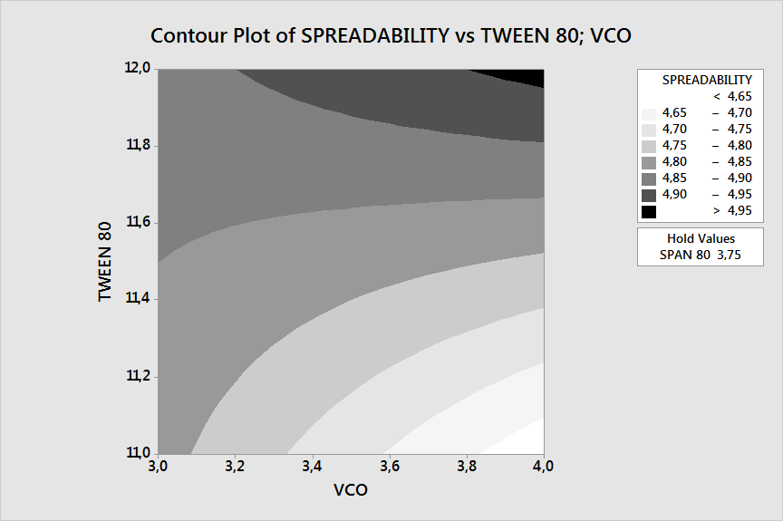 Fig. 5 is a contour plot showing the interaction results between tween-80, span-80, and VCO on the 2D spreadability measurement response. Based on the resulting plot, it can be concluded that the area that shows the optimum concentration of VCO, tween-80, and span-80 on the dispersion response is only the black area.
