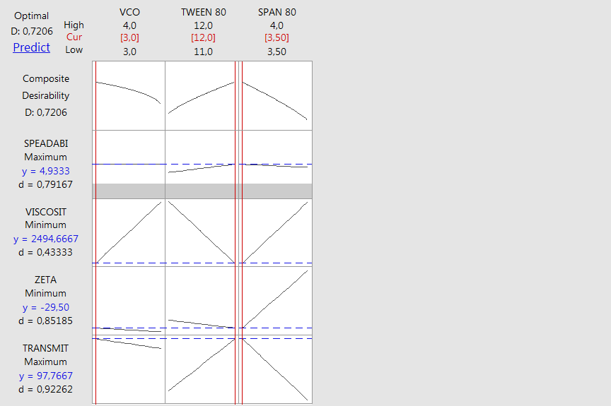 Optimization targets were set for the response of dispersion, viscosity, zeta potential, and percent transmittance. The response optimizer menu in the Minitab® 18 software determines the optimum formula with multiple responses [39]. The results of processing and computational recommendations to achieve the optimum conditions were found at the VCO amount of 3g, the tween amount of 12g, and the span amount of 3.5g was found as computational recommendations to achieve the optimum conditions. But this concentration is predicted to produce a composite desirability value of all responses of 0.7206. This is not considered good because a desirability value close to 1 indicates a high model's ability to produce the expected response value fig. 6 [39]. From the results obtained, only the percent transmittance has a desirability close to 1, which is 0.922, so the optimum response for the formula is only the transmittance percent.