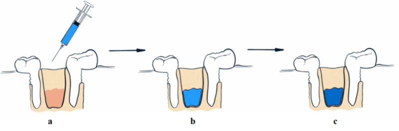 Fig. 1: The scheme of the in situ implant application, a–Implantation with a pre-filled syringe, b-The implant fills the alveolar socket, с-Sol-gel transition
