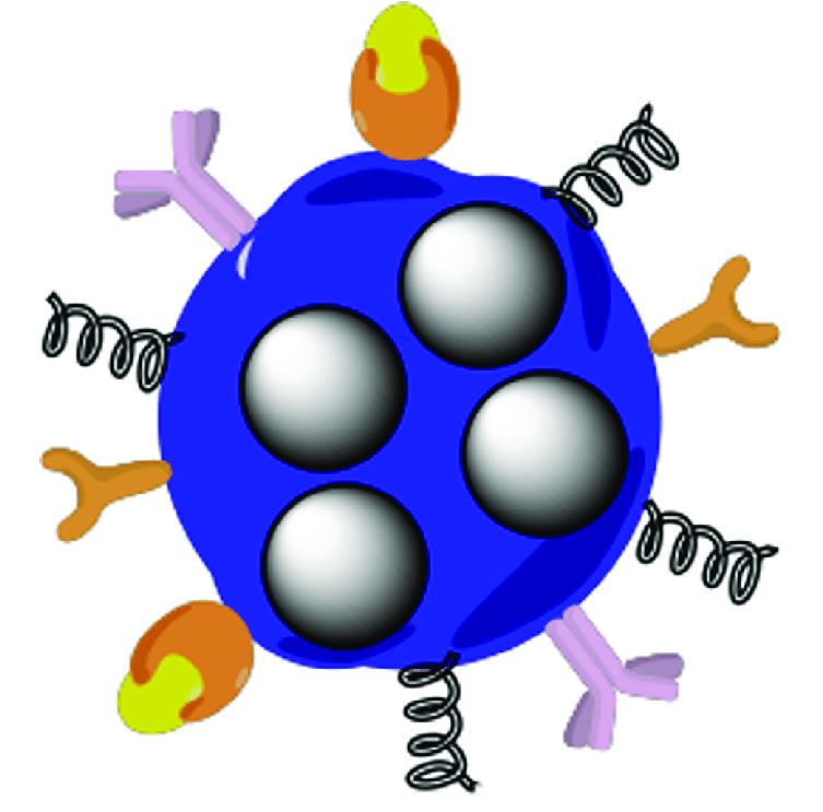 Fig. 2: Representation of a smart multifunctional drug-loaded nanoparticle decorated with various moieties for targeting, imaging and stealth properties [99]