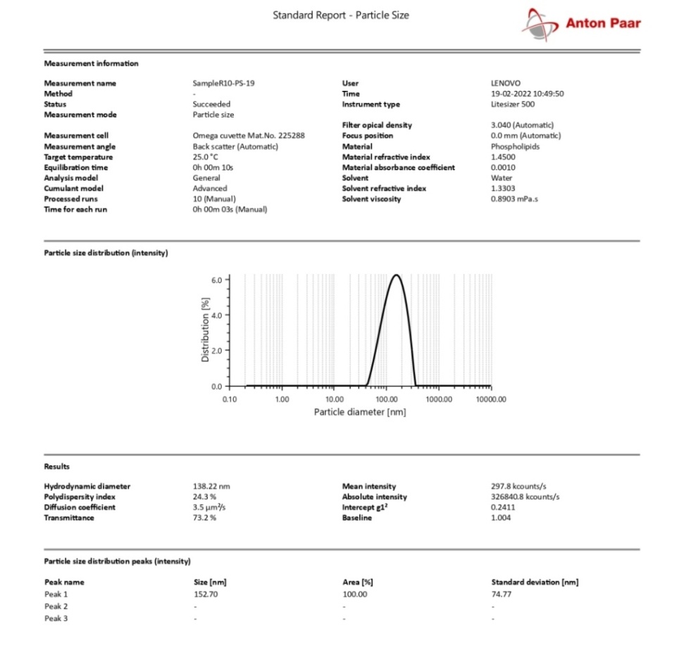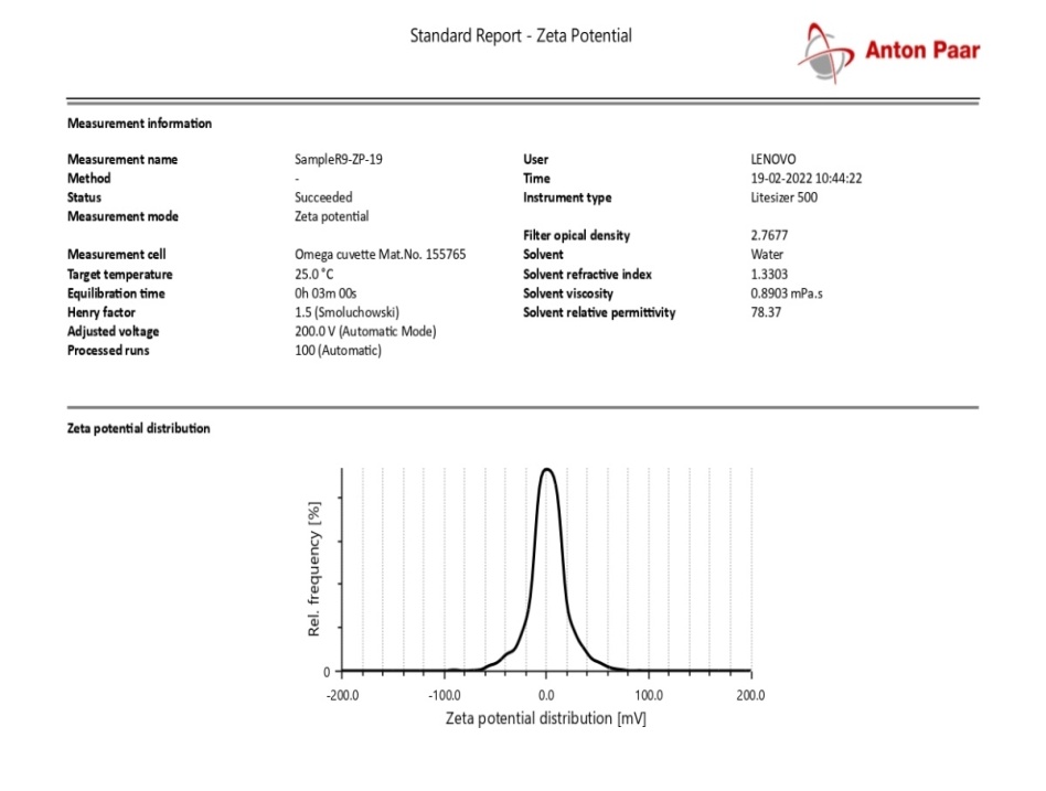 Zetasizer (Anton Paar's Litesizer TM 500) was used to determine particle size, PDI, and zeta potential by photon correlation spectroscopy. RT-SLNs were diluted ten times with double distilled water prior to assessing size, PDI, and zeta potential. By placing 1 ml of the diluted formulation in a disposable folding capillary cell for zeta potential measurements at 25 °C and a polystyrene omega cuvette, respectively, particle size and PDI measurements were carried out. At a wavelength of 263 nm and a scattering angle of 90°, the dynamic light scattering measurements were performed using a helium-neon laser as the light source. Brownian motion causes particle diffusion, which is transferred into particle size. When an electric field is applied, particles with potential zeta move at a velocity corresponding to their zeta potential. This zeta potential is detected using a methodology named phase analysis light scattering and is transformed by Lenovo software [17].